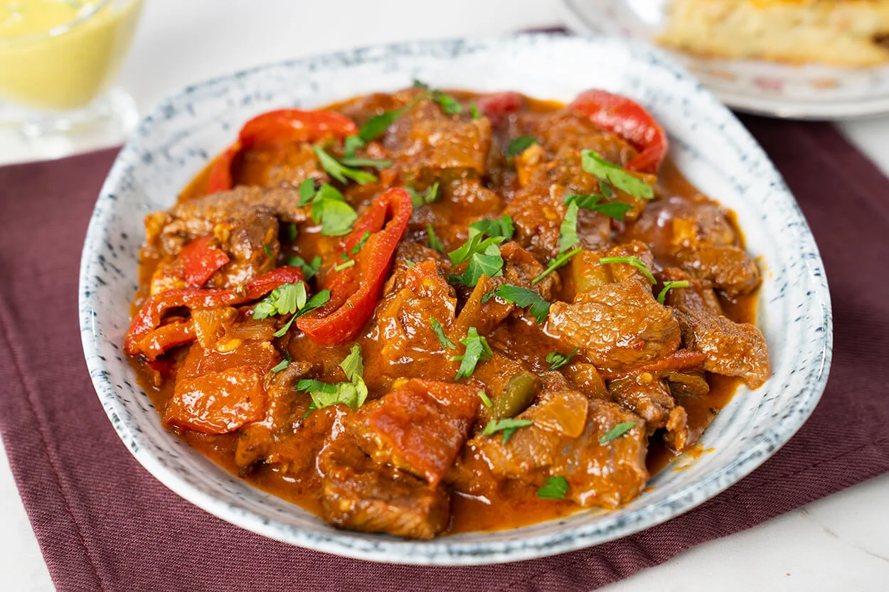 Küçük doğranmış dana eti, domates, biber, soğan ve sarımsak ile kavrulup baharatlarla lezzetlendirilmiş sulu bir yemek.