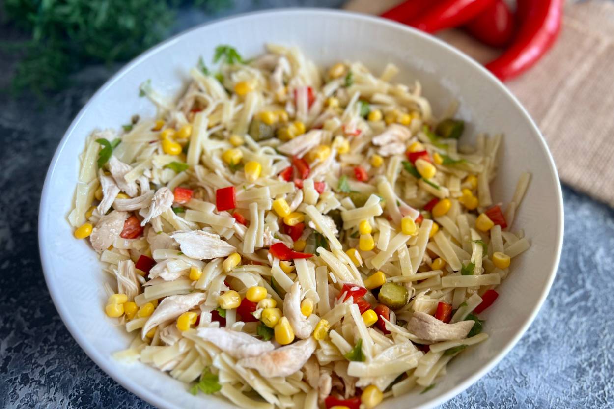 Izgara tavuk parçaları, marul, mısır ve sos eşliğinde servis edilen doyurucu bir salata.